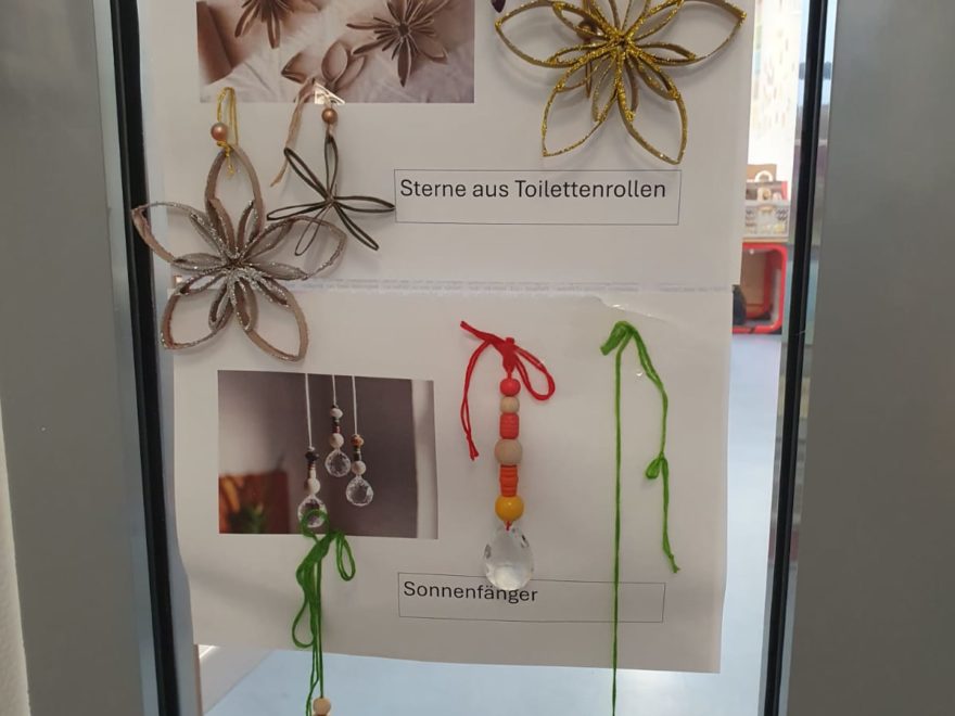 Es wurden Kerzen marmoriert, Christbaumschmuck gestaltet und Marmeladengläser mit Serviettentechnik verziert. Auch zahlreiche winterliche Bastelideen sorgten für Freude und Abwechslung.